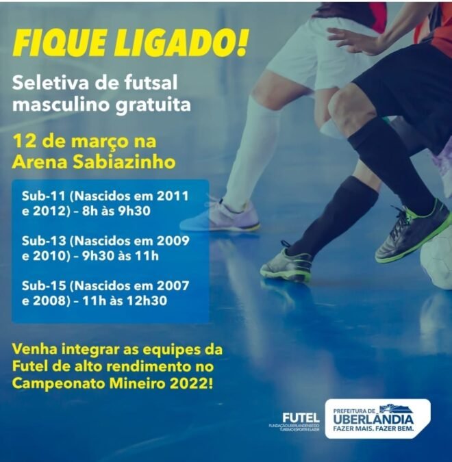 A Fundação Uberlandense do Turismo, Esporte e Lazer (Futel) promove, neste sábado (12) à tarde, na Arena Sabiazinho, a seletiva de futsal masculino nas categorias sub-11, sub-13 e sub-15. O objetivo é selecionar atletas para integrar as equipes de alto rendimento da Futel, que vão disputar o Campeonato Mineiro 2022, que deverá acontecer a partir de abril. A participação é gratuita e os atletas selecionados começarão a treinar a partir da semana que vem no centro de treinamento do bairro Patrimônio (Poliesportivo Patrimônio).