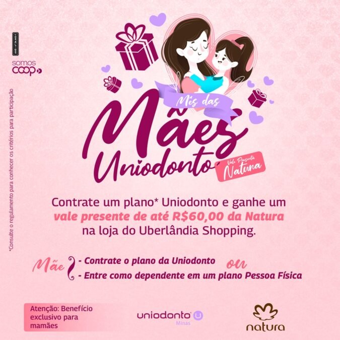 A Uniodonto traz uma campanha especial em comemoração ao mês das mães. Contratando um plano Uniodonto em Maio, a mãe ganhará um vale presente de até R$60,00 para comprar na loja da Natura do Uberlândia Shopping. Promoção válida somente nesse mês de Maio. Para saber todas as condições e requisitos para participar da campanha Mês das Mães Uniodonto, acesse https://uniodontominas.com.br/campanha-mes-das-maes