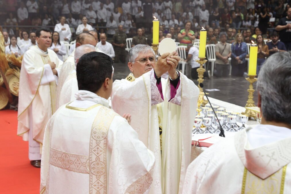 O ginásio Sabiazinho recebeu na quinta-feira, 8 de junho, a solenidade de Corpus Christi, diante de um público de mais de 8 mil pessoas. Promovido pela Diocese de Uberlândia, com apoio Futel, o evento foi presidido pelo Bispo Diocesano Dom Paulo Francisco Machado (foto), com auxilio de diversos padres e diáconos, e contou com a presença da primeira dama do Município e deputada federal Ana Paula Junqueira, representando o prefeito Odelmo Leão, o deputado estadual Leonídio Bouças e outras autoridades. Esta foi a primeira grande concentração de fiéis na celebração do ‘Corpo de Cristo’, depois da pandemia da Covid-19.