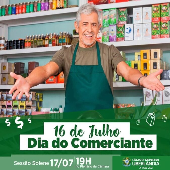 A Câmara Municipal de Uberlândia irá comemorar com uma sessão solene, às 19h do dia 17 de julho próximo, uma segunda-feira, o Dia do Comerciante. Na solenidade, vereadores estarão outorgando diplomas a profissionais que trabalham na área do comércio em nossa cidade e que geralmente trabalham vendendo algum tipo de produto.