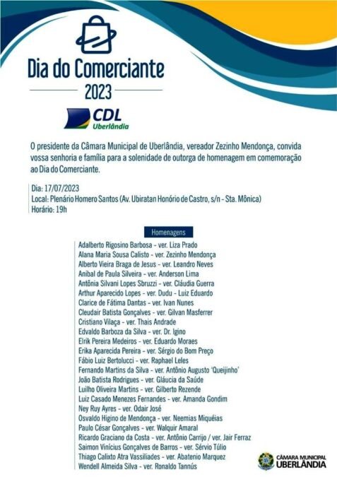 O Dia do Comerciante é comemorado em 16 de Julho, neste ano de 2023 a data caiu em um domingo, por isso a Câmara Municipal de Uberlândia realizará nesta segunda-feira (17), Sessão Solene para referenciar a data, às 19h no plenário Homero Santos, quando, cada um dos vereadores, homenageará um comerciante da cidade, que tenha se destacada no último ano.