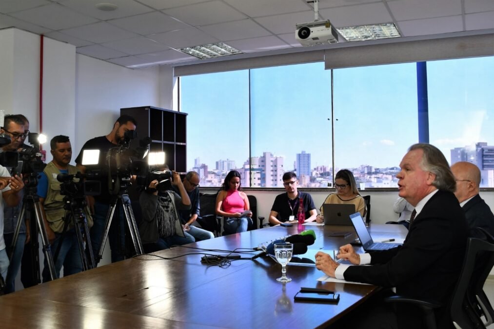 O reitor da Universidade Federal de Uberlândia (UFU), Valder Steffen Junior, e o vice-reitor, Carlos Henrique Martins da Silva, concederam uma entrevista coletiva à imprensa na manhã da quinta-feira (17/8), para esclarecimento de dúvidas quanto à atual situação do atendimento à população realizada pelo Hospital de Clínicas (HC-UFU/Ebserh), diante do quadro de superlotação do Pronto-Socorro daquela unidade de saúde.