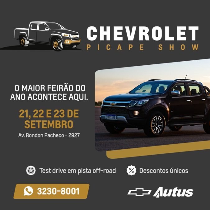 A Autus Chevrolet realizará nos dias 21, 22 e 23 de setembro na Avenida Rondon Pacheco, número 2927, em Uberlândia, o Feirão de Fábrica 2023. O evento promete descontos nos valores dos veículos e uma experiência única de pista com a caminhonete S10.
