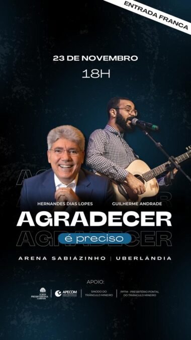 A Igreja Presbiteriana de Uberlândia e região promove no dia 23 de novembro um grande culto que terá como tema: “Agradecer é Preciso”. Ele será ministrado pelo preletor conhecido nacionalmente, Pastor Hernandes Dias Lopes e terá como atração o músico Guilherme Andrade.