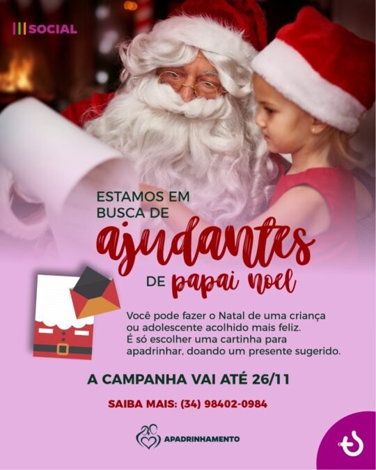 Para mais informações sobre a campanha “Apadrinhe uma Cartinha”, entre em contato com o Programa de Apadrinhamento da Missão Sal da Terra pelo WhatsApp (34) 98402-0984.