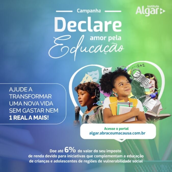 Ao utilizar o Imposto de Renda, apoiar ações sociais não custa nada. Até o dia 20 de dezembro, pessoas físicas podem fazer doações para iniciativas apoiadas pelo Instituto Algar e receber a restituição do valor destinado às causas sociais ao fazer a Declaração do Imposto de Renda 2024. A arrecadação será direcionada para a realização de oficinas de artes cênicas do Emcantar Cia Cultural e para atividades esportivas promovidas na organização social Ação Moradia. As doações podem ser destinadas pelo site algar.abraceumacausa.com.br .