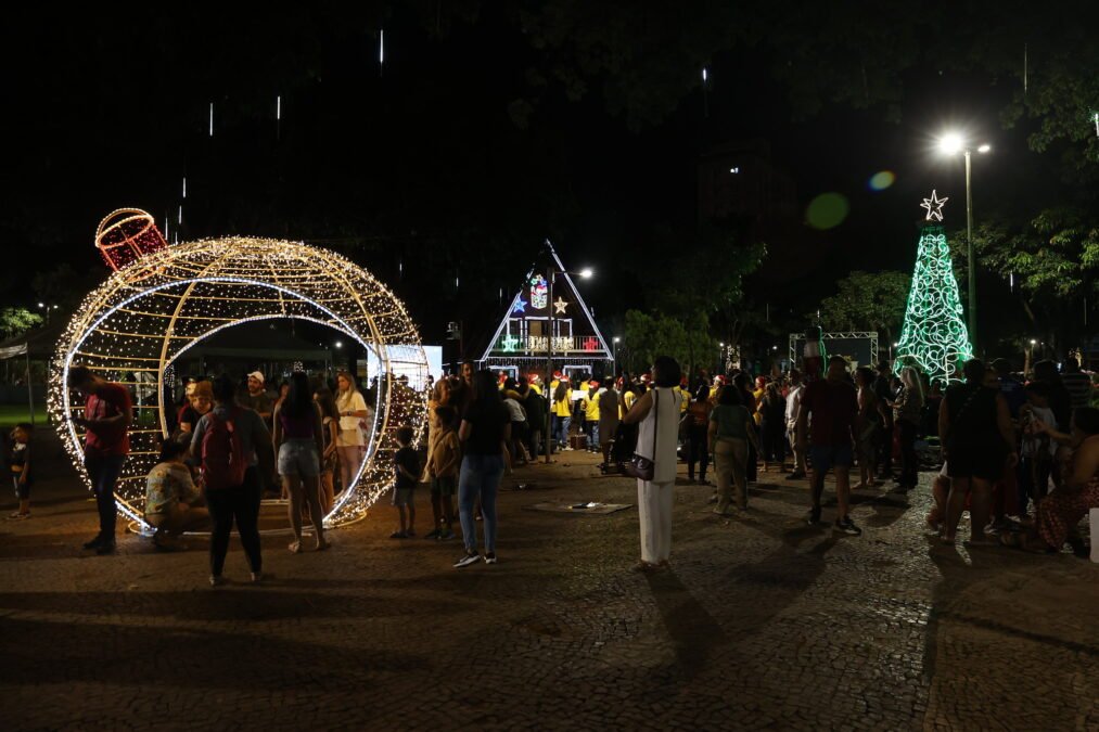 - Praça da Bíblia (Estação Rodoviária – Bairro Martins): árvores decoradas, figuras natalinas em postes e letreiro “Feliz Natal”;