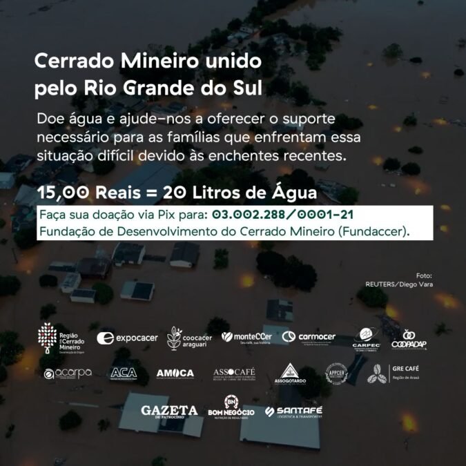 “Unimos esforços em intercooperação com todas as entidades filiadas ao Sistema Região do Cerrado Mineiro, ouvimos lideranças e pessoas do Rio Grande do Sul, formamos um grupo de trabalho e definimos iniciar pela doação de água por ser um item fundamental na sobrevivência das pessoas e que tem o seu sistema de fornecimento neste momento em colapso no Estado. Portanto, iremos mobilizar toda a cadeia do café em nossa Região para doações que serão revertidas na compra de água”, destaca o diretor executivo da Federação dos Cafeicultores do Cerrado, Juliano Tarabal.