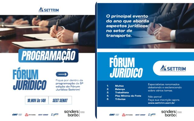 O Settrim (Sindicato das Empresas de Transporte de Carga e Logística do Triângulo Mineiro) se prepara para realizar, no dia 18 de novembro, às 14h, no SEST SENAT, a 5ª edição do Fórum Jurídico Settrim, evento que já se consolidou como um dos principais momentos de atualização e integração entre empresários, gestores e profissionais do setor de transporte.