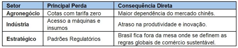 Se o acordo fracassar agora, o Mercosul tende a buscar laços ainda mais estreitos com a China, diminuindo a influência europeia na América Latina. Para o Brasil e seus vizinhos, o fim do tratado representaria a perda de uma oportunidade histórica de modernização industrial e acesso a um mercado de alto poder aquisitivo. Segue, breve resumo das principais perdas para o Brasil, caso o acordo não seja assinado.