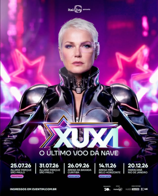 A apresentadora e cantora Xuxa Meneghel anunciou a turnê “O Último Voo da Nave” e incluiu Belo Horizonte na rota do espetáculo. A apresentação na capital mineira está marcada para o dia 14 de novembro, às 20h, na Arena MRV.
