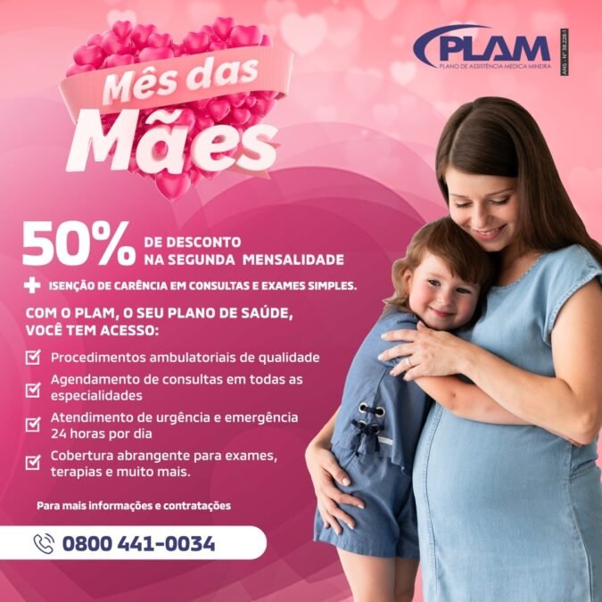 Cuidar da saúde é primordial em todas as fases da vida. Nesse mês das mães, o PLAM – Plano de saúde está com uma ação especial onde o cliente que adquirir o plano ganhará 50% de desconto na segunda mensalidade e ainda, isenção de carência em consultas e exames simples.